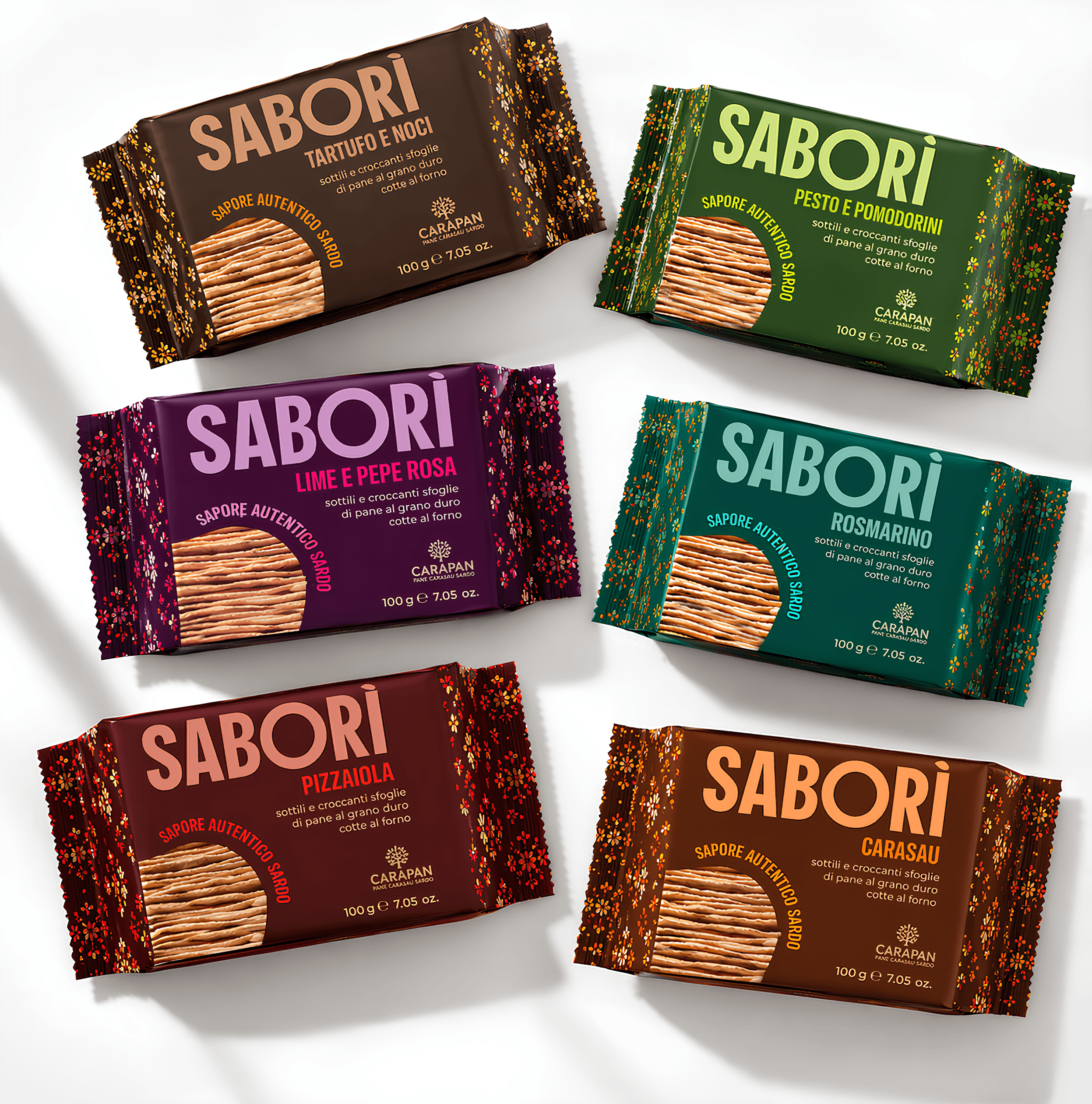 In Sardinia, food is never just food, it is sharing, culture, and history. But why remain anchored only to the past? Saborì reimagines traditional pane carasau, preserving its authentic essence while enriching it with contemporary flavors. Like a modern Janus, it looks toward the future without losing sight of its roots. This project focused on creating a complete visual identity for a Sardinian pane carasau snack, positioning it within a premium, gourmet market while conveying a strong sense of refinement and high quality. Driven by the desire to merge tradition and modernity, we developed a pattern whose symbols are inspired by a traditional element of Sardinian culture: woven carpets. The motifs and geometries that define it reinterpret these artisanal designs in a contemporary way, creating a distinctive and cohesive visual language.